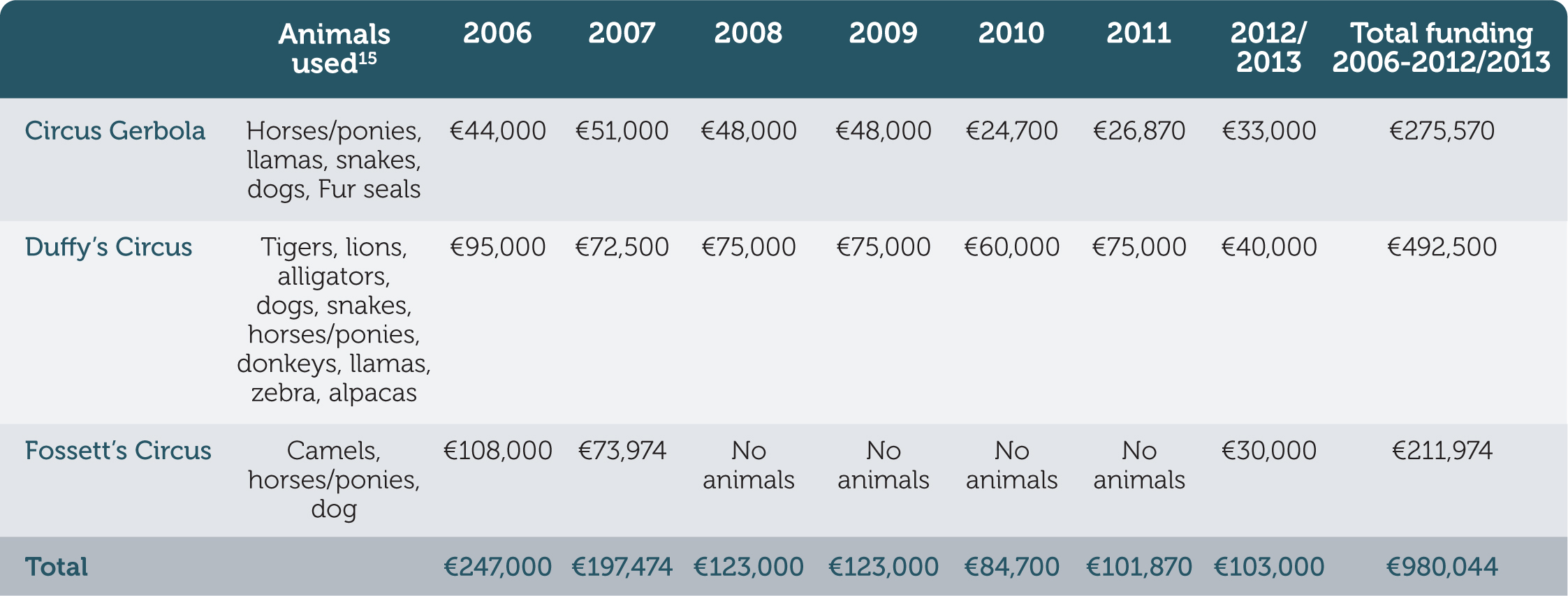In total, almost €1,000,000 has been granted to circuses that use animals since 2006, which represents over 50% of all Arts Council funding for circuses (all-human and animal) overall.